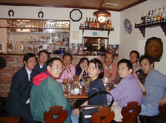 三次会の喫茶・アルカラの店内です。会長の得意技のモバイルを